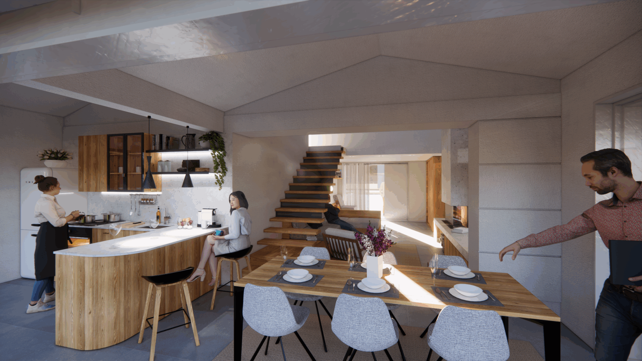 Le rez-de-chaussée sera légèrement abaissé de 20 à 30 cm, selon les possibilités techniques, ce qui suffira pour améliorer la hauteur sous plafond de l’entrée projetée. Le séjour, quant à lui, bénéficiera d’une double hauteur grâce à la démolition prévue du plancher bas du salon actuel. Une extension en L enveloppera partiellement les façades sud et ouest de la maison au rez-de-jardin. Les nouvelles cuisine et salle à manger s’ouvriront largement sur le jardin grâce à des baies vitrées pliantes-coulissantes en accordéon, permettant de transformer toute la façade en un espace ouvert pendant la belle saison. La chambre située au rez-de-chaussée s’ouvrira également au sud et à l’ouest. Une terrasse à l’angle sud-ouest sera accessible depuis la salle à manger et la chambre, offrant une exposition optimale et un espace extérieur convivial. Une partie du rez-de-jardin sera dédiée à l’entrée piétonne et au séjour, tandis que le reste accueillera les fonctions annexes et techniques de la maison (buanderie, local vélos, chaufferie, abri jardin/bricolage). Un nouvel accès en façade sud permettra de relier directement le jardin aux espaces techniques. La chaufferie restera à son emplacement actuel pour minimiser les coûts de plomberie lors du remplacement de la chaudière. La buanderie sera située à proximité de l’entrée, de l’escalier et de la chambre du rez-de-jardin pour en optimiser l’usage au quotidien.